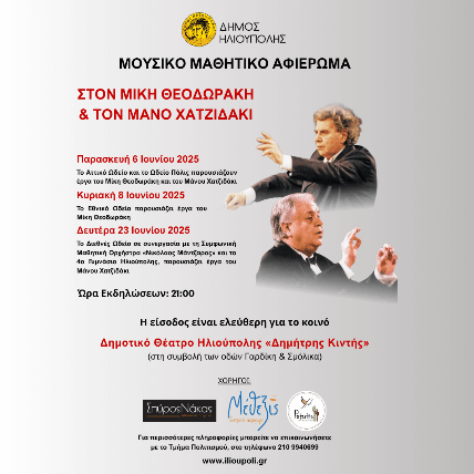 Ο Δήμος Ηλιούπολης τιμά δύο εμβληματικές μορφές της ελληνικής μουσικής, τον Μίκη Θεοδωράκη και τον Μάνο Χατζιδάκι, μέσα από ένα ξεχωριστό μουσικό μαθητικό αφιέρωμα, που θα φιλοξενηθεί στο Δημοτικό Θέατρο Ηλιούπολης «Δημήτρης Κιντής».