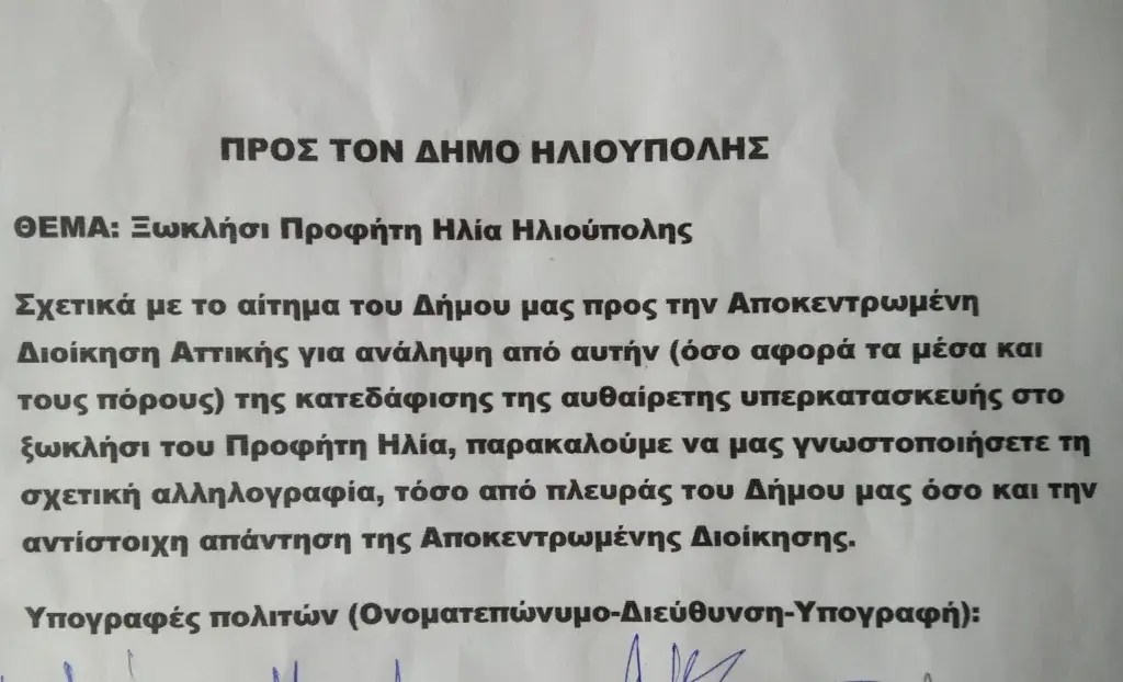 Σε συλλογή υπογραφών προχώρησαν δεκάδες κάτοικοι της Ηλιούπολης, ζητώντας επίσημα όλη την αλληλογραφία μεταξύ υπηρεσιών σχετικά με την παράνομη και αυθαίρετη κατασκευή που έχει «σκεπάσει» εδώ και 6 χρόνια τον προφήτη Ηλία στην Ηλιούπολη.