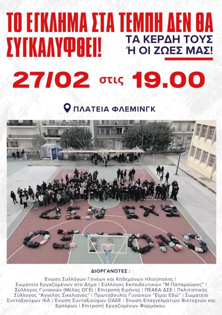 Μία ημέρα πριν την πανελλαδική απεργία και διαμαρτυρίαμε αφορμή την τραγική επέτειο του δυστυχήματος των Τεμπών, 12 συλλογικότητες που δραστηριοποιούνται στην Ηλιούπολη διοργανώνουν συγκέντρωση διαμαρτυρίας στην πλατεία Φλέμινγκ.