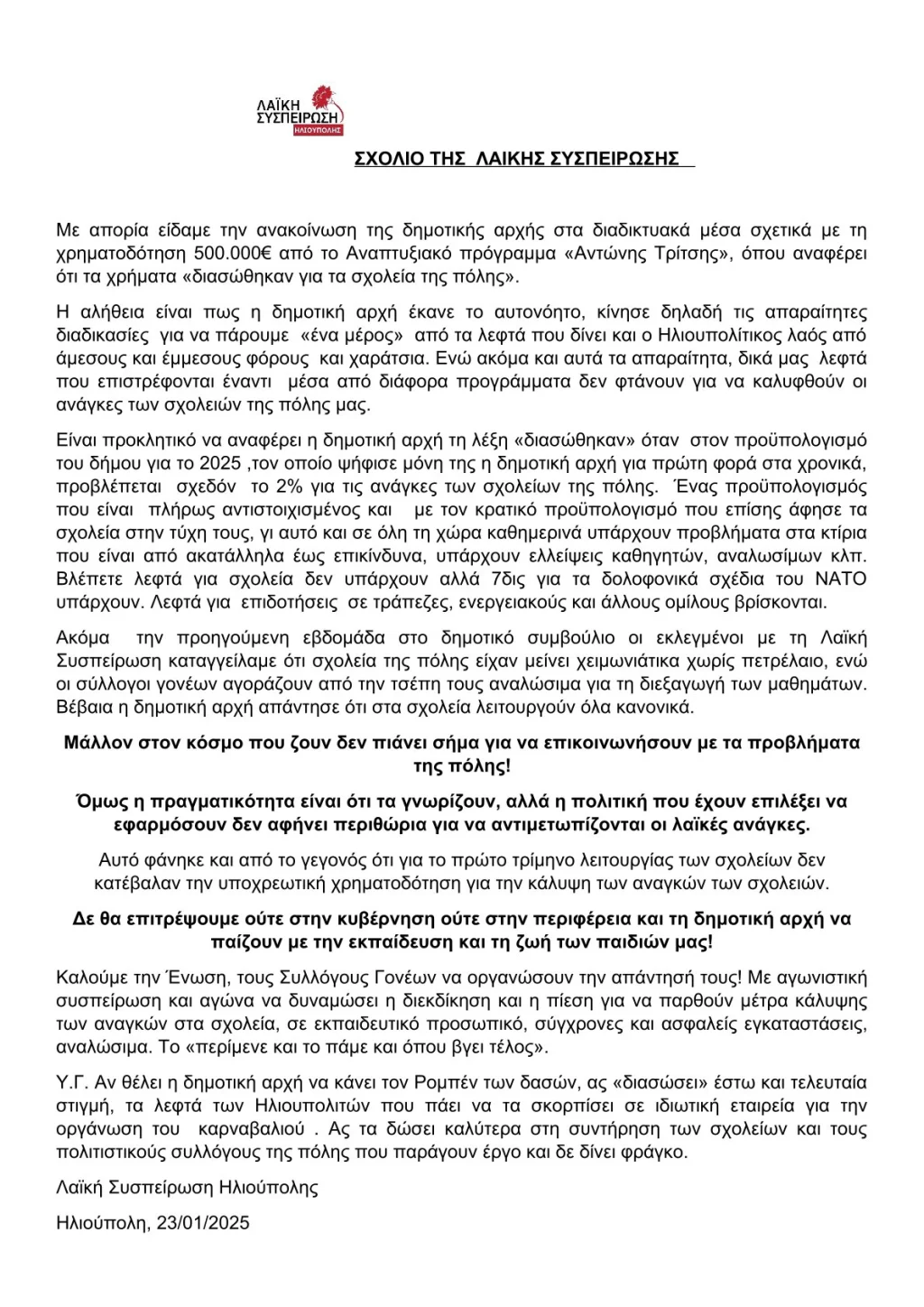 «Η αλήθεια είναι πως η δημοτική αρχή έκανε το αυτονόητο, κίνησε δηλαδή τις απαραίτητες διαδικασίες για να πάρουμε «ένα μέρος» από τα λεφτά που δίνει και ο Ηλιουπολίτικος λαός από άμεσους και έμμεσους φόρους και χαράτσια», αναφέρει η ανακοίνωση της λαϊκής συσπείρωσης, και συμπληρώνει: «Είναι προκλητικό να αναφέρει η δημοτική αρχή τη λέξη «διασώθηκαν» όταν στον προϋπολογισμό του δήμου για το 2025 ,τον οποίο ψήφισε μόνη της η δημοτική αρχή για πρώτη φορά στα χρονικά, προβλέπεται σχεδόν το 2% για τις ανάγκες των σχολείων της πόλης».